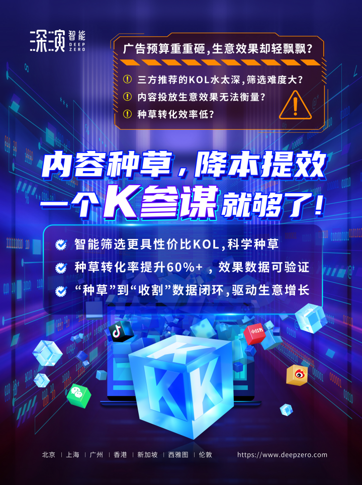 PA旗舰厅智能K参谋科学前选,可跨领域找到最能影响品牌目标TA人群的KOL进行投放,同时有效平衡投资回报率;内容营销数据可同电商后链路平台打通,进行数据归因分析,准确判断KOL影响的用户是否真实在电商平台产生购买行为;实现“种草”到“收割”链路闭环,轻松内容营销,可根据品牌方的业务需求提供一站式的KOL采买及数据验证服务,有利提升整体内容营销的效率与效果。